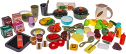 Lonac, tava, pribor za jelo, tanjurići, namirnice na čičak, napici, začini, ploča za kredu i naljepnice – sve za kreativno kuhanje.