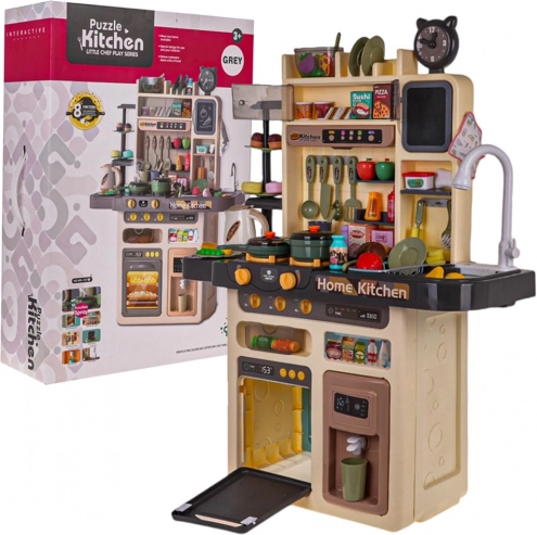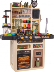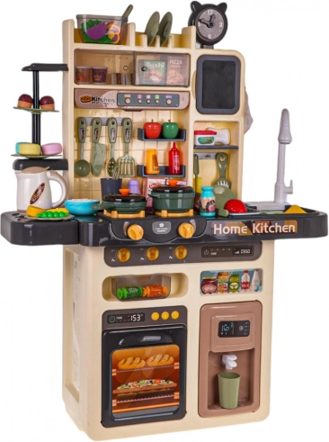Ova prostrana dječja kuhinjica pretvara sobu u mali gastronomski kutak. Djeca će uživati u realističnim elementima poput osvijetljenih plamenika sa zvukovima prženja i kuhanja, pare iz jednog od plamenika i slavine s tekućom vodom. Otvorite pećnicu, pospremite namirnice u hladnjak s dozatorom vode, zavrtite upravljačke gumbe i upalite napu s glazbenom pločom.