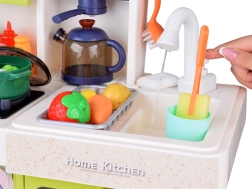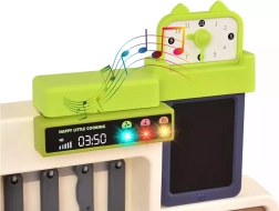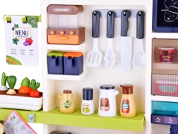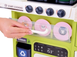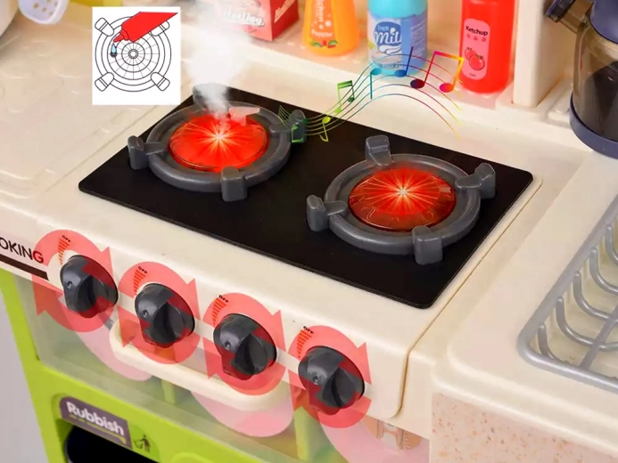 Multifunkcionalna kuhinjica u umirujućim bojama nudi djeci autentičan doživljaj kuhanja: dva pozadinski osvijetljena plamenika sa zvukovima, siguran efekt pare, funkcionalnu slavinu s kruženjem vode i otvarajuću pećnicu, hladnjak i ormariće za pregledno odlaganje opreme. Zahvaljujući glazbenom panelu sa svjetlosnim efektima, ploči za poruke i satovima s pomičnim kazaljkama igra je još raznolikija.