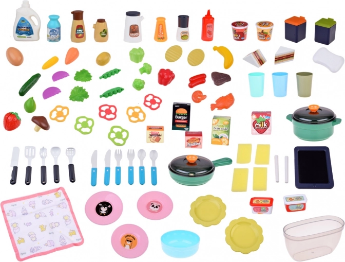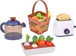 Tanjuri, lonci, tava s poklopcem, vrč, pribor za jelo, kuhinjski pribor, košarica za povrće, namirnice, umaci, začini i toster s tostovima – sve pri ruci za kreativnu igru uloga.