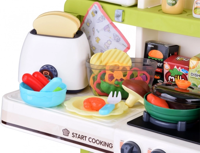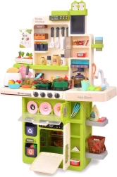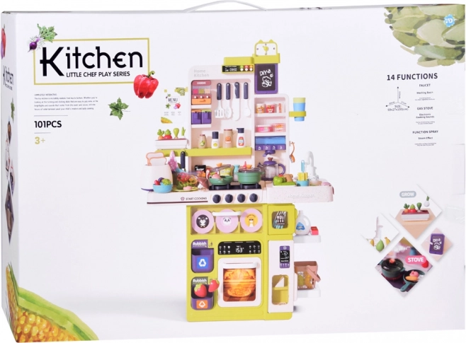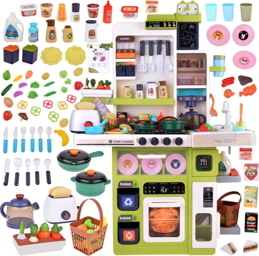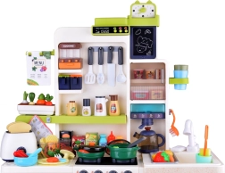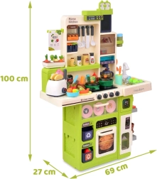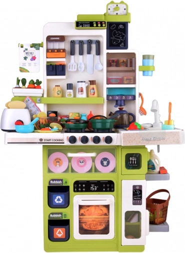 Otkrijte realističnu dječju kuhinjicu koja donosi svjetlosne i zvučne efekte, siguran efekt pare tijekom “kuhanja” i tekuću vodu iz slavine. Dio paketa je 101 dodatak za beskrajnu igru uloga kuhanja, pečenja i čišćenja. Stabilna konstrukcija, otvarajuća vrata, glazbeni panel, ploča za kredu i učeći sat potiču maštu, finu motoriku i socijalne vještine djece.