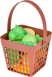 Kuhinjska set sadrži posuđe, lonce, pribor te igračke-prehrambene proizvode, uključujući košaru za povrće i spremnike za razvrstavanje.