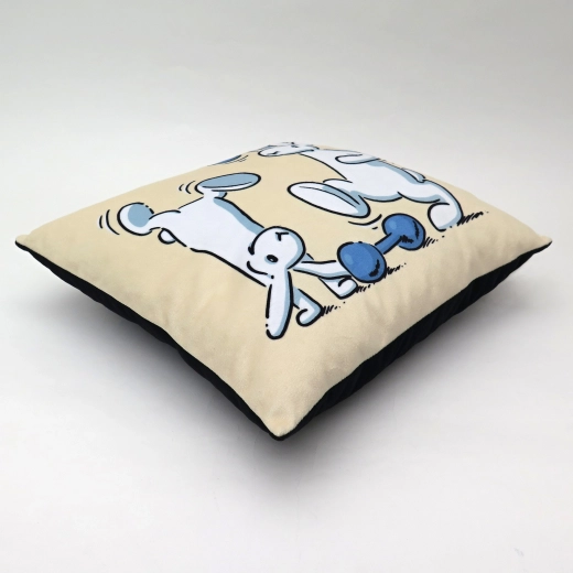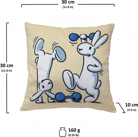Mekani jastučić s zečićima BOB I BOBEK i motivom utega razveselit će djecu kod kuće i na putovanjima. Mikrovelur, šuplje vlakno, pranje na 30 °C, ručna izrada u RH, dimenzija 30 × 30 cm.