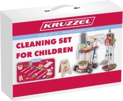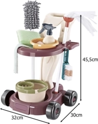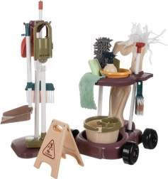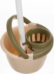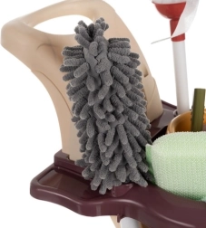 Kolica s ergonomskom ručkom - kolica na četiri široka kotača, izrađena od visokokvalitetne PP plastike, dizajnirana su za lako manevriranje. Ergonomska široka ručka djeci olakšava upravljanje kolicima i tijekom igre u pokretu. Na dvjema policamamogu se smjestiti razni elementi seta: kanta sa sitom za cijeđenje mopa na donjoj polici te posuda, podloška, cjedilo i posudica za sapun na gornjoj polici. Zahvaljujući posebnim otvorima u kolica se mogu smjestiti okrugla metlica za prašinu, spužva i mop, što omogućuje lak pristup svim alatima. Sa strane kolica nalaze se dvije kukice za vješanje krpe od mikrovlakana.