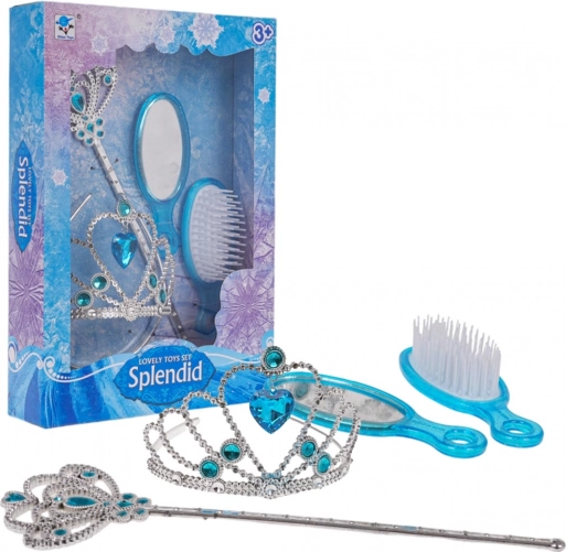 Očaravajući set za male princeze od 3 godine razveselit će svaku ljubiteljicu bajki. U kompletu su tijara, čarobni štapić, zrcalce i četka za kosu s nježnim plavim ukrasima. Sigurna izrada, kvalitetni materijali i čarobni svjetlucavi detalji potiču maštu i igru uloga.