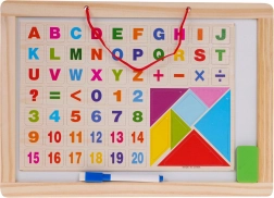 Ova drvena ploča potiče prirodnu dječju znatiželju i učenje kroz igru. Jedna strana je crna kredna za crtanje i pisanje kredama, druga bijela suho brisiva za pisanje flomasterom. Zahvaljujući magnetima sa slovima i brojkama djeca lako uvježbavaju abecedu, računanje i oblike.