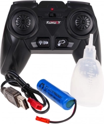 Daljinsko upravljanje 2,4 GHz omogućuje glatko upravljanje naprijed, natrag, desno i lijevo bez smetnji. Integrirani punjivi akumulator 3,7 V 500 mAh osigurava dovoljno energije za igru, a punjenje se vrši preko USB-a. Efekt dima aktivira se pomoću priložene bočice za vodu za još realističniji doživljaj.