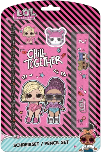 Stilizan školski set s motivom LOL Surprise sadrži sve potrebno za pisanje i bilješke. U pakiranju se nalaze olovka, gumica u obliku, kutijica za šiljilo, ravnalo i bilježnica u obliku – idealno za školu i za dom.