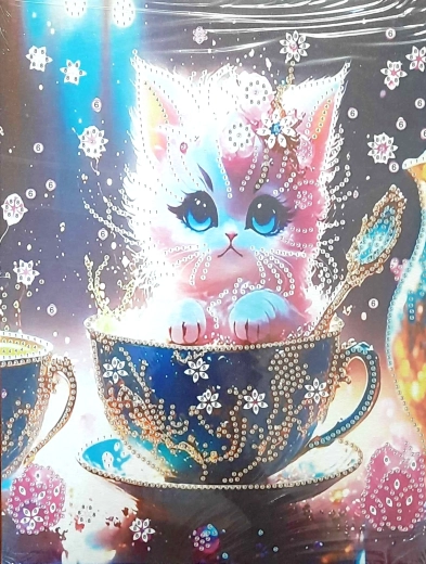 Stvorite vlastitu blistavu sliku s motivom preslatkog mačića u šalici i uživajte u opuštajućem kreativnom stvaranju za djecu i odrasle. Set sadrži sve potrebno – platno s čvrstim okvirom, šarene kamenčiće, aplikacijsko pero, posudicu i vosak. Jednostavno dijamantno slikanje bez potrebe za umjetničkim vještinama idealno je kao kreativan poklon i zajednička zabava za cijelu obitelj.