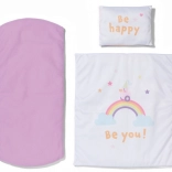 Mekani jastučić, pokrivač i podloga s veselim natpisima i motivima duge omogućuju mijenjanje izgleda kolijevke prema raspoloženju.