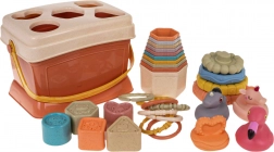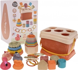 Dječji set s oblicima i sortirkom izvrstan je edukativni set za djecu od 6 mjeseci. Razvija dječju maštu i uči ih prepoznavati boje i oblike. Svaki element ovog seta dizajniran je tako da živim bojama i zanimljivim oblicima privuče pažnju djece i potakne ih na igru.
