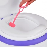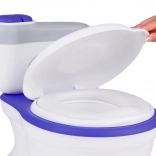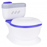 Realistična dječja kahlica u obliku WC-a s mekanim sjedalom i ugrađenom kutijom za vlažne maramice pomaže djeci savladati odvikavanje od pelena na zabavan način. Pritiskom na tipku reproducira zvuk ispiranja i vesele melodije, ima izvadivu posudu za lako čišćenje, stabilnu konstrukciju, a dio kompleta je i četkica za čišćenje.