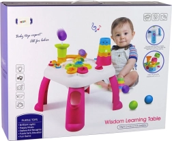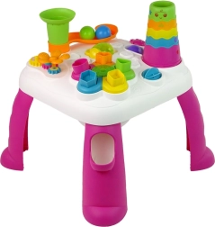 Ovaj multifunkcionalni edukativni stolić u ružičasto-bijeloj izvedbi nudi raznolik spektar aktivnosti za osjetilni razvoj i zabavu. Dijete se kroz igru uči razlikovati boje i oblike, vježba manulane vještine i promatra uzrok i posljedicu – primjerice pri puštanju kuglica niz tobogan.