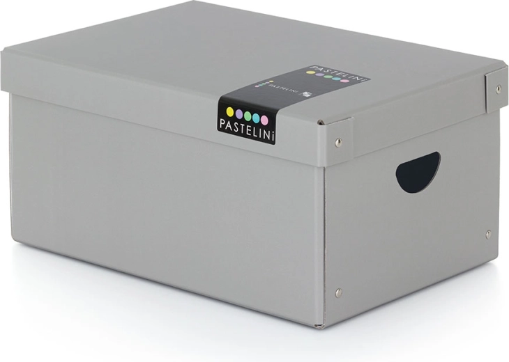 Velika laminirana kutija PASTELINI u elegantnoj sivoj boji idealna je za pohranu raznih predmeta. Zahvaljujući pametnom dizajnu s poklopcem i izrezima za ručke nudi jednostavno rukovanje.