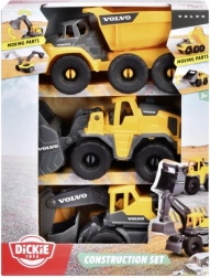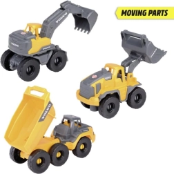 Građevinski set VOLVO s tri detaljna građevinska stroja razveselit će male graditelje od 3 godine. Utovarivač na kotačima, bager i zglobni kiper u mjerilu 1:36 imaju pokretne dijelove i pogon na slobodan hod. Svako vozilo mjeri 16 cm i u ikoničnim bojama žuta/siva nudi realističnu igru kod kuće i na putu.
