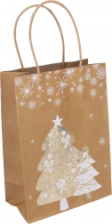 Stilska božićna poklon-vrećica veličine M (21 × 27 × 11 cm) za jednostavno i elegantno pakiranje darova. Dostupna u 4 varijante motiva koje vašem poklonu daju blagdansku atmosferu i štede vrijeme pri pakiranju.