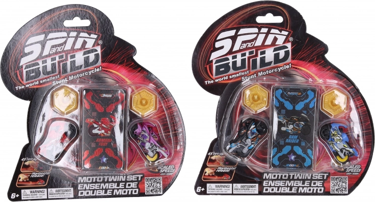 Spin and Build motocikli omogućuju beskrajne sate zabave zahvaljujući svojoj kompatibilnosti s lansirnim stazama W037925, W037924 i W037923. Veličina motocikala je 4,5 cm i dolaze u nekoliko varijanti.