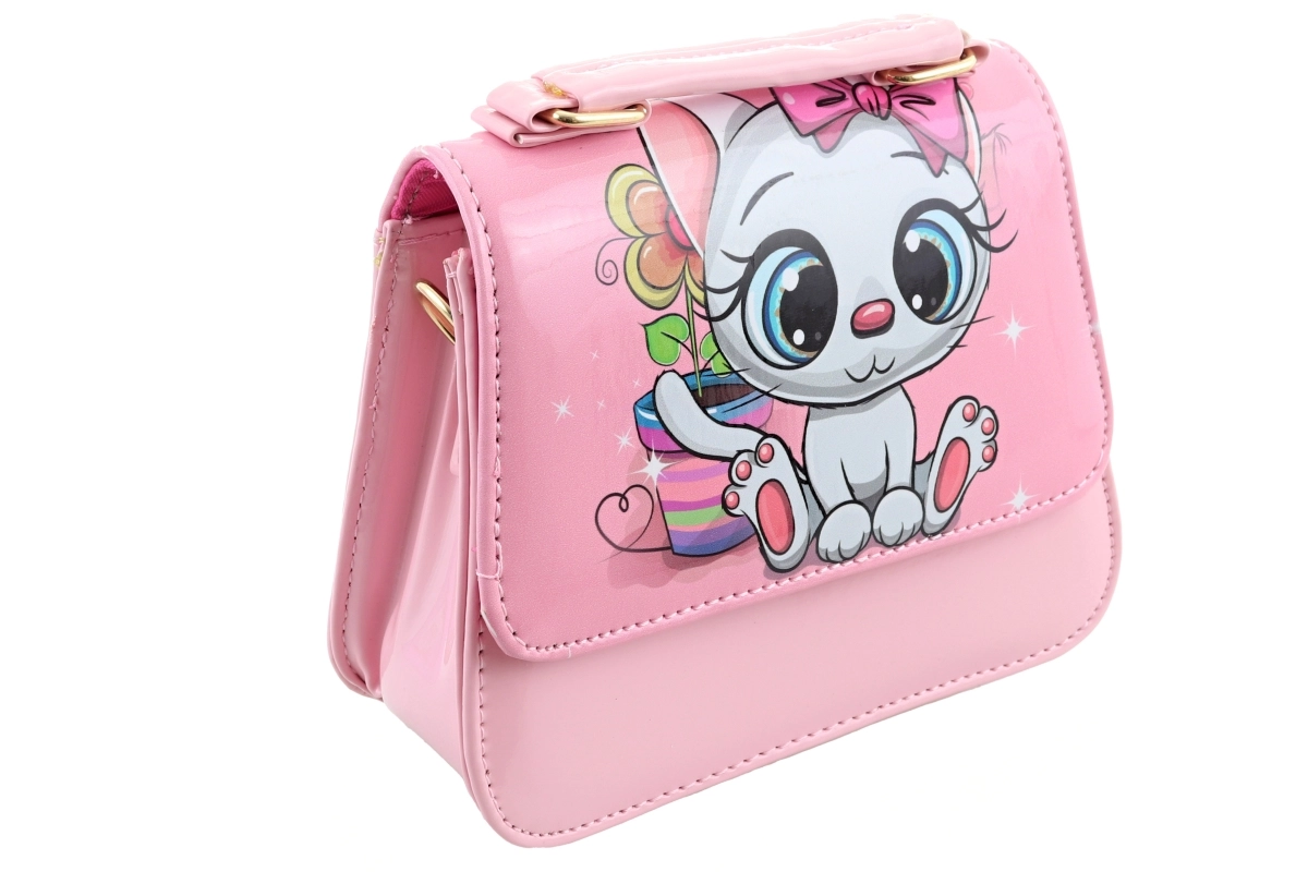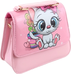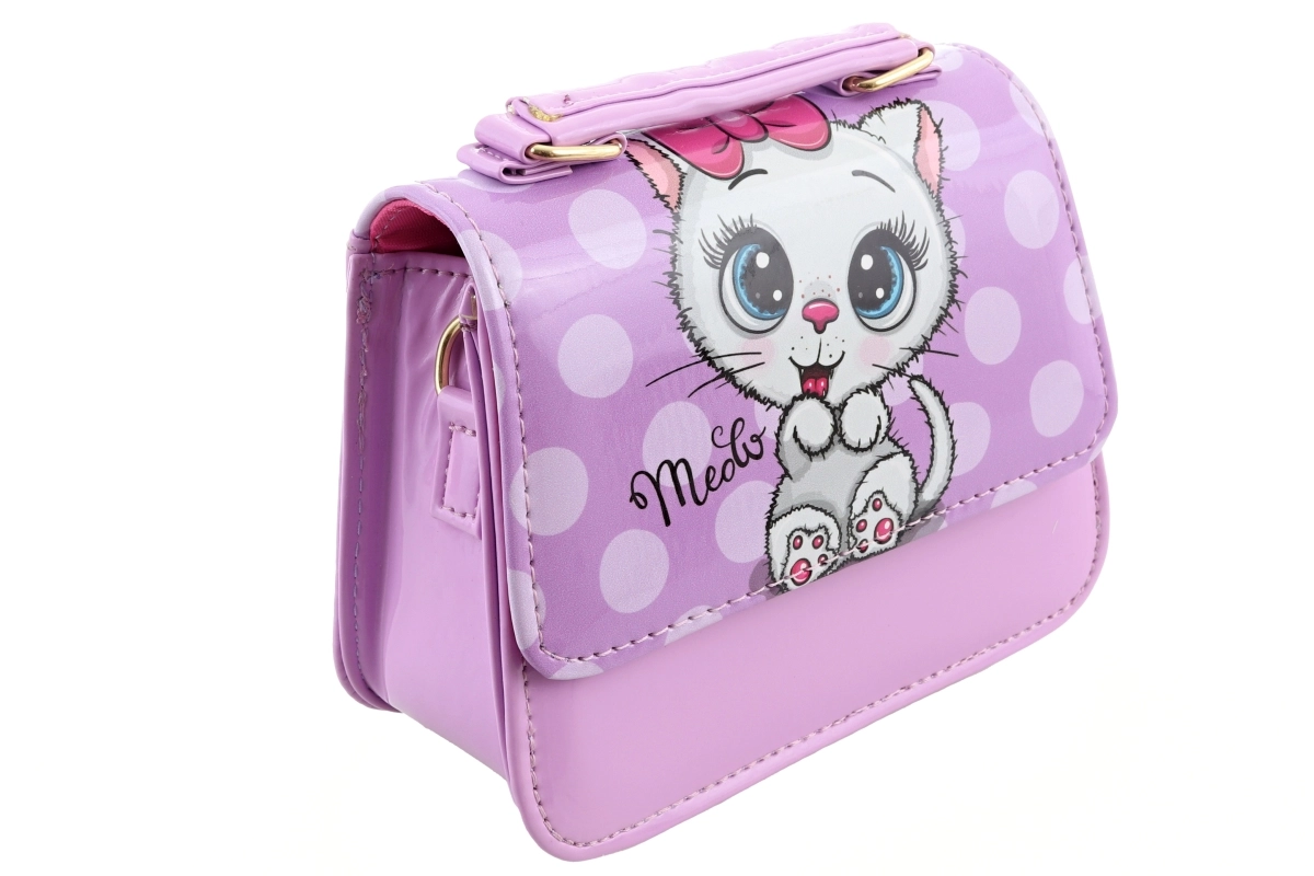 Šarena torbica s motivom mačkice. Unutra 1 velika pregrada. Dimenzije 16x15x6 cm. Pakirano u vrećici. 2 vrste - isporučujemo prema dostupnosti na skladištu. Dob 3+