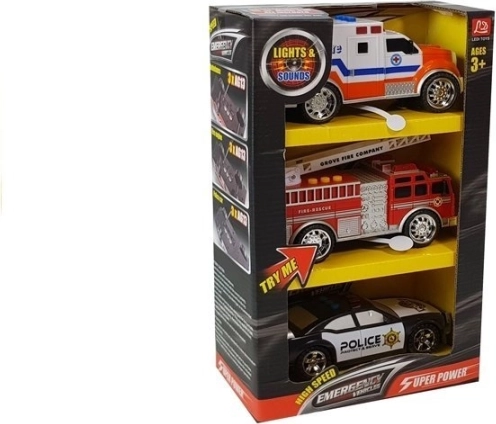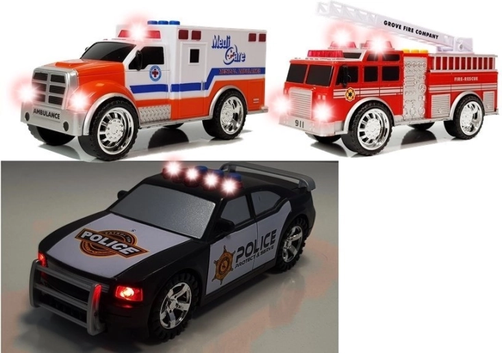 Ovaj set spasilačkih vozila oduševit će sve male ljubitelje akcije i uzbuđenja. U pakiranju se nalaze policijski auto, vatrogasno vozilo i hitna pomoć – svaki model ima izražajne boje, tipične natpise i elemente koji djeci lako približavaju rad stvarnih žurnih službi. Pritiskom na tipke uključuju se crvena svjetla i oglašavaju sirene i truba, što igru čini još realističnijom.