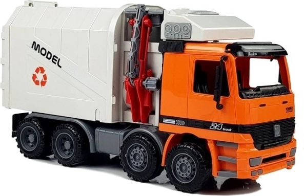 Veliki smetarski kamion u narančasto‑bijeloj boji donosi realističnu igru razvrstavanja otpada. Robusna izrada, otvarajući kontejner i trenjni pogon jamče glatku vožnju i puno akcije pri utovaru i istresanju. Otvorena kabina omogućuje smještaj figurica vozača i suvozača (nisu dio pakiranja).