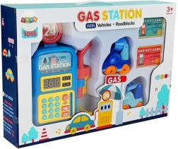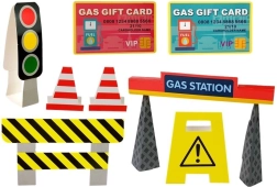Benzinska postaja, 2 autića (miješalica betona i vatrogasno), prometni dodaci (semafor, znakovi, čunjevi, barijera), 2 “kartice”