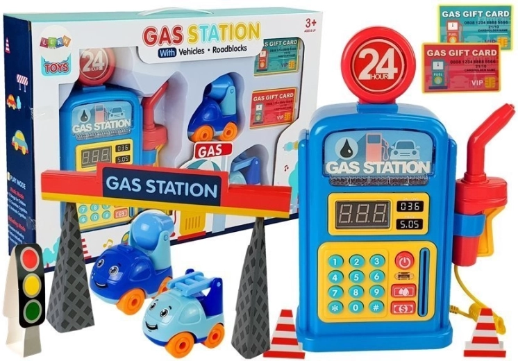 Zabavna dječja benzinska postaja u plavo-žutoj izvedbi donosi realistično točenje goriva s autićima. Nudi svjetlosne i zvučne efekte, upute na engleskom jeziku, utor za platne kartice i brojač litara pri pritisku na ručku. Dio seta su 2 nasmijana autića (miješalica betona i vatrogasno vozilo s ljestvama), prometni znakovi, čunjevi i drugi dodaci za beskrajnu kreativnu igru.