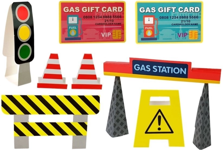 - Benzinska postaja, 2 autića (miješalica betona i vatrogasno), prometni dodaci (semafor, znakovi, čunjevi, barijera), 2 “kartice”