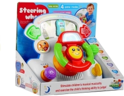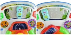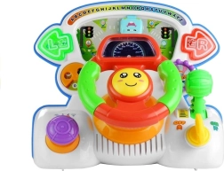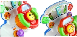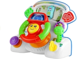 Interaktivni volan na komandnoj ploči donosi djeci realističan doživljaj vožnje u razigranom i sigurnom izdanju. Okretni elementi, ručica mjenjača, ključ u kontakt-bravi i pokazivači smjera popraćeni su bljeskajućim svjetlima i različitim zvučnim efektima. Pri okretanju volana pomiče se plavi autić po “cesti”, a pomak brzinskog kotača pokreće vesele zvukove i druga interaktivna iznenađenja.