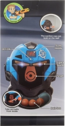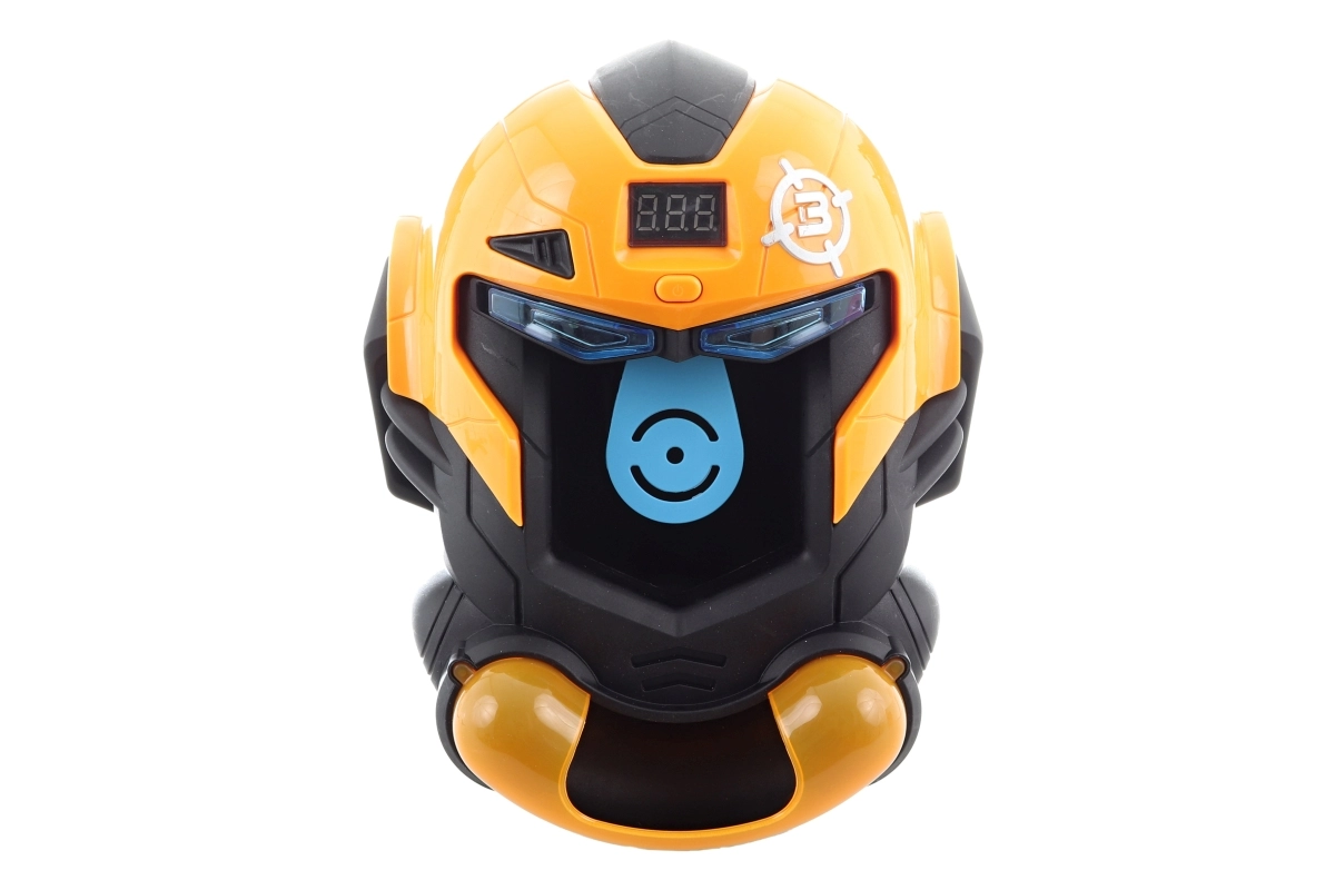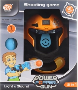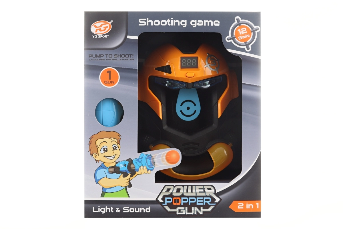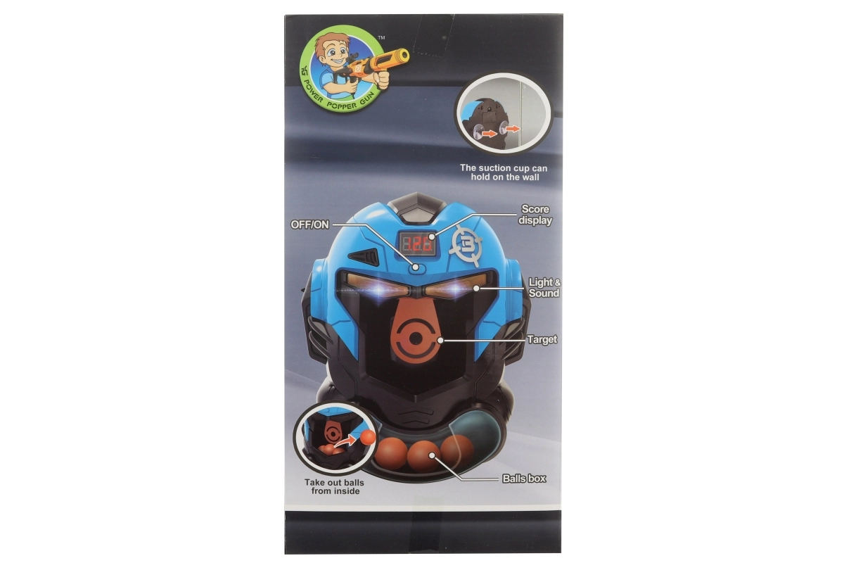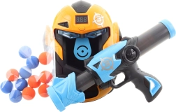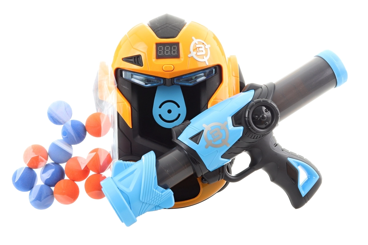 Detaljan set pištolja za pjenaste loptice i mete u obliku maske. Meta ima brojač na baterije (2x AA – nisu uključene u pakiranje). Nakon umetanja baterija i pogotka cilja, brojač zbraja bodove i emitira tonove. Materijal: plastika. Pakirano u kutiji. Dimenzije pakiranja cca 25 × 29 × 14 cm. Dob: 8+