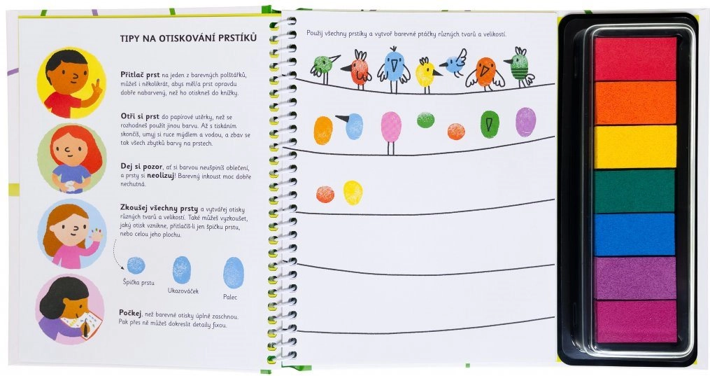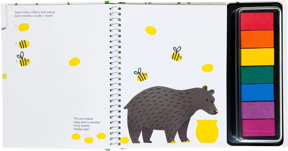 Zaronite s djecom u svijet boja i kreativnosti uz knjigu Otisni prstiće - Aktivnosti sa životinjama. Dovoljno je podići poklopac s obojenih jastučića s tintom i krenuti s otiskivanjem. Ova knjiga potiče djecu da isprobaju različite prste i stvaraju otiske raznih oblika i veličina. Kreativni elementi u knjizi djeci omogućuju dodati vlastite detalje otiscima.
