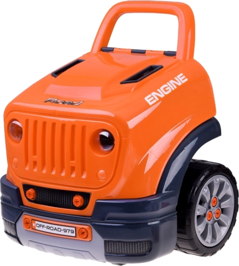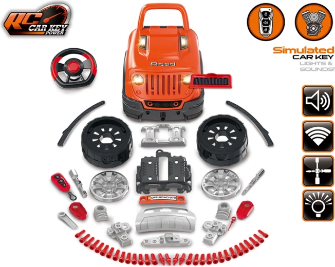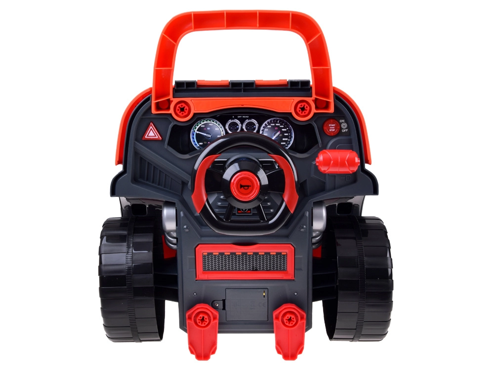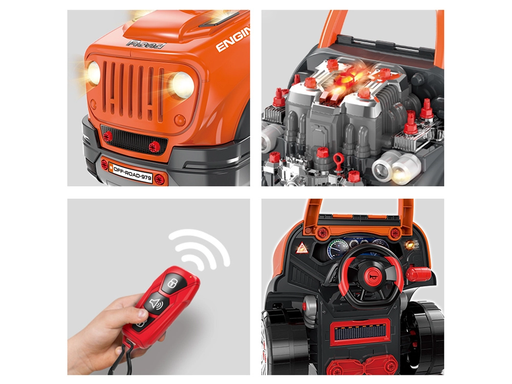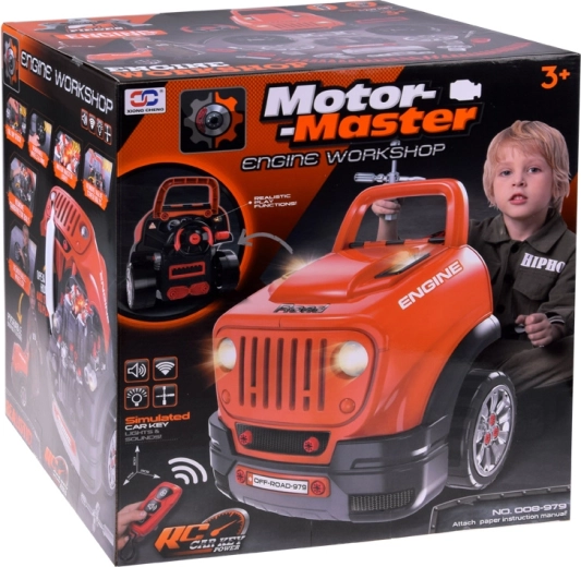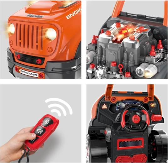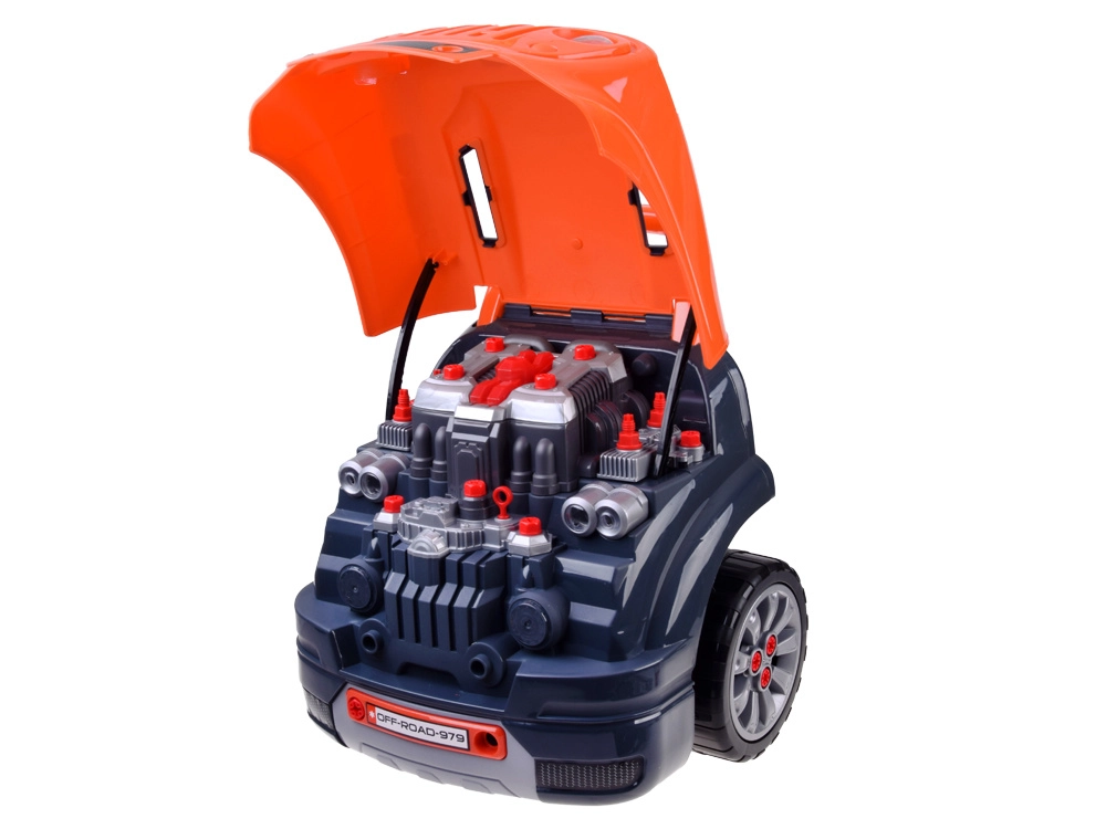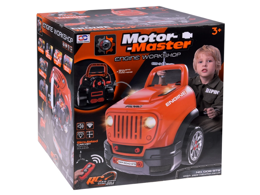 Interaktivni radionički set za male mehaničare realistički simulira rad u autoservisu. Djeca mogu otvoriti poklopac, rastaviti i ponovno sastaviti izvadivi motor, mijenjati kotače i poklopce, isprobati paljenje na gumb te koristiti zvučne i svjetlosne efekte – od trube i vožnje unatrag do alarma i svjetala za opasnost.