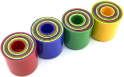 Čašice su od izdržljive plastike, lako se čiste i, zahvaljujući mogućnosti ugnježđivanja, zauzimaju minimalno prostora. Pogodne su za igru kod kuće i na putu, na tepihu i u pijesku.