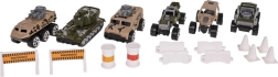 Set uključuje 6 metalnih/odbojenih autića tipa “resorak” i bogat pribor (stošci, ogradice, barijere, bačve) za izgradnju vlastitih poligona s preprekama i vojnih scenarija. Praktična ručica za prenošenje olakšava djetetu ponijeti kamion kamo god ide.