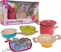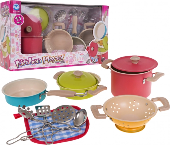 Razvijajte dječju maštu s 11-dijelnim setom metalnog posuđa i alata za male kuhare od 3 godine. Set sadrži lonce s poklopcima, tavu, cjedilo i pribor te oduševljava živim bojama, izdržljivom metalnom izradom i bogatom opremom za realističnu igru kuhanja.