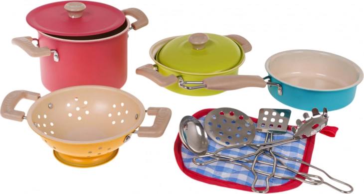 Ovaj šareni set dječjeg posuđa donosi autentičan doživljaj kuhanja u svaku dječju kuhinju. Dva lonca s poklopcima, tava, cjedilo i četiri praktična kuhinjska alata pružaju sve što djeca trebaju za oponašanje pravog kuhanja. Zahvaljujući metalnim materijalima set je čvrst, izdržljiv i spreman za svakodnevnu igru.