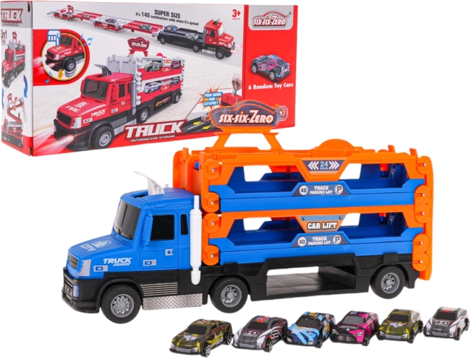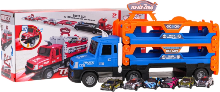 Ovaj višerazinski kamion odličan je poklon za male vozače. U zatvorenom stanju služi kao praktični sorter i garaža za autiće, a nakon otvaranja stvara dugi sustav staza (140 cm). Dovoljno je položiti autić na najnižu razinu i pritisnuti polugu na krovu – katapult ga izbacuje naprijed i zabava može početi.