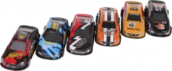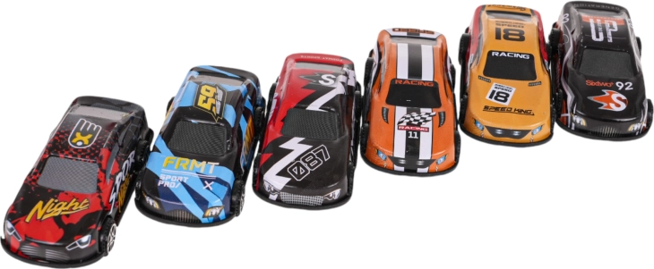 Uključeno je šest detaljno izrađenih trkaćih automobila u mjerilu 1:64 s izdržljivom metalnom karoserijom, spremnih za trenutne utrke.