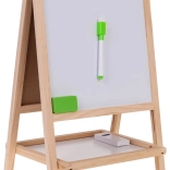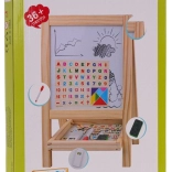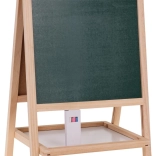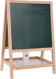 Obostrana drvena ploča idealna je za kreativnu igru i učenje djece starije od 3 godine. S jedne strane djeca je mogu koristiti s flomasterom, dok je druga strana namijenjena crtanju kredom. Ploča je s obje strane magnetna, što omogućuje pričvršćivanje magnetskih slovnih znakova, brojeva, matematičkih operacija i prostornih oblika. Praktična polica na donjoj strani ploče olakšava odlaganje svih priloženih dodataka.