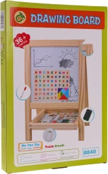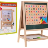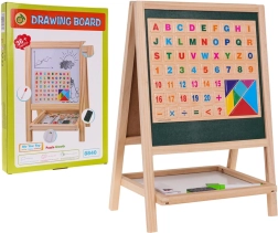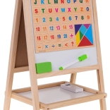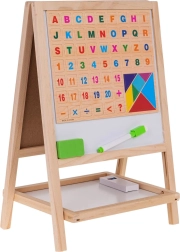 Drvena obostrana ploča za djecu od 3 godine. Jedna strana je bijela za crtanje flomasterom, druga crna za crtanje kredom. Ploča je magnetna s obje strane i uključuje slova, brojeve i geometrijske oblike na magnetima.