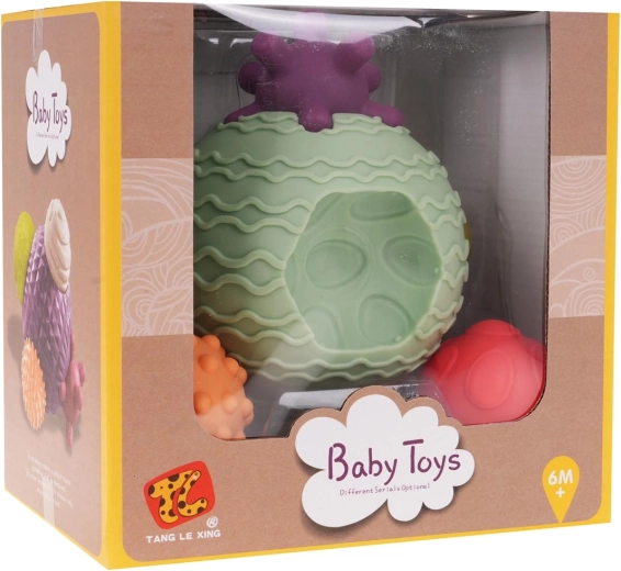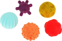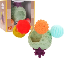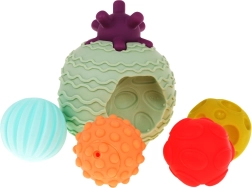 Ova senzorička lopta idealan je pratitelj za kupanje male djece. Set sadrži jednu veliku loptu i četiri manje loptice s različitim teksturama i oblicima. Glavna lopta ima udubljenja u koja se umeću manje loptice, što pomaže djetetu učiti razlikovati različite boje i oblike.