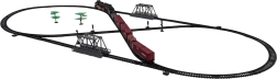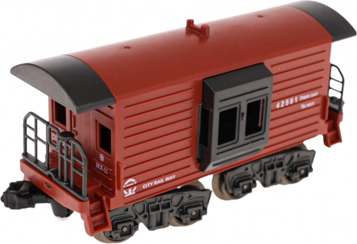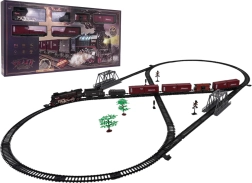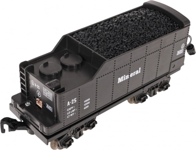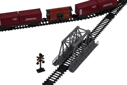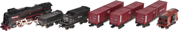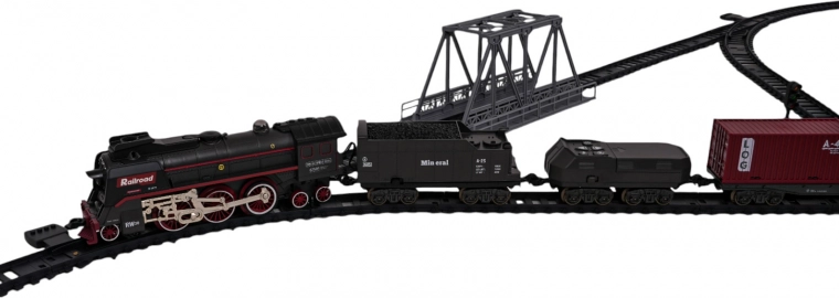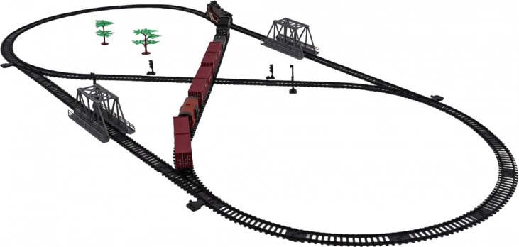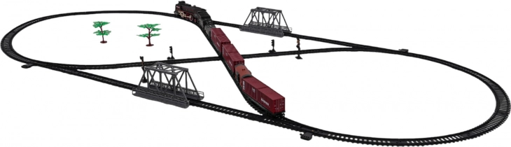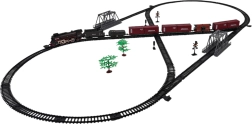 Dimenzije . | - lokomotiva cca 23 cm x 8 cm x 5,5 cm .- putnički vagon cca 13 cm x 6 cm x 4,5 cm, .- vagon za ugljen cca 14,5 cm x 7 cm x 4,5 cm, .- vagon s pilotom cca 12,5 cm x 5 cm x 4,5 cm, .- vagon s kontejnerima cca 22,5 cm x 7 cm x 4,5 cm, .- tračnice cca 216 cm x 99 cm, .- pakiranje cca 87,5 cm x 43 cm x 9,5 cm, . |