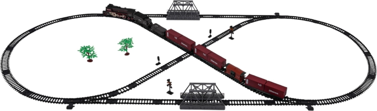 . | - lokomotiva, .- putnički vagon, .- vagon za ugljen, - vagon s pilotom, - 3 x vagon s kontejnerima, .- dijelovi tračnica, .- 2 mosta, .- 2 znaka, .- 2 stabla, .- vodena pipeta, .- USB kabel za punjenje, .- priručnik, . |