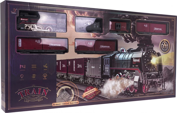 Preporučujemo. . | Retro vlak-set s funkcijom dima, zvukovima vožnje i tračnicama u pakiranju, prikladan za djecu od 3 godine. Igračka se napaja punjivom baterijom 3,7 V (uključena u isporuku), daljinski upravljač koristi 2 x AA 1,5 V baterije (nisu uključene). Daljinski upravljač je ujedno jedno od vozila. Tijekom vožnje lokomotiva ispušta dim iz dimnjaka i s bočnih strana (nakon punjenja vodom – vodena pipeta je dio seta), a dodatno svijetli prednje svjetlo. Tračnice imaju jednostavan način spajanja, sigurne su i čvrste za upotrebu. .. Funkcije seta: . - prikladno za djecu od 3 godine, . - dim izlazi iz dimnjaka i slijeva se niz bočne strane, .- prednje svjetlo na lokomotivi, .- zvukovi tijekom vožnje, .- vožnja naprijed-nazad. |
