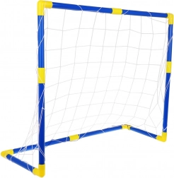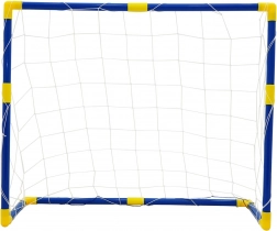 Plave cijevi sa žutim spojnicama lako se uklapaju jedna u drugu i stvaraju stabilan okvir. Mreža je čvrsto pričvršćena oko konstrukcije, tako da gol možete postaviti i prenijeti u trenu.