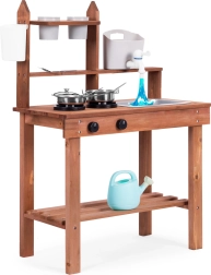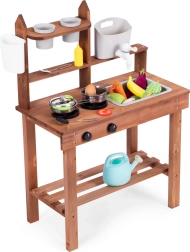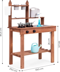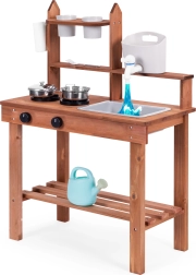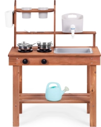 Potiče igre uloga i omogućuje djeci “kuhanje” od pijeska, blata ili kamenčića. Pregledne police i kukice drže posuđe pri ruci, dok kompaktne dimenzije olakšavaju smještaj i u manjim prostorima.