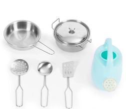 U kompletu su lonac s poklopcem, tava, dvije lopatice, kutlača i vrč – sve spremno za male kulinarske eksperimente.