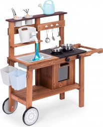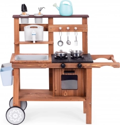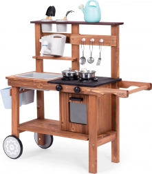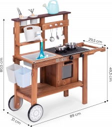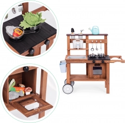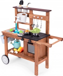 Dječja vanjska blatna kuhinjica od jelovine marke ECOTOYS donosi realističnu igru kuhanja kod kuće i u vrtu. Nudi radnu slavinu s spremnikom za vodu, okretne gumbe plamenika s klikanjem, sudoper, ormarić/pećnicu i praktična kotačića za lako premještanje. U kompletu je set metalnih i vrtných dodataka, zahvaljujući kojima djeca razvijaju kreativnost i finu motoriku.