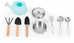 - 10 kom (lonac, poklopac, tava, lopatica, cjedilo, kutlača, zalijevača, 3× vrtni alat)