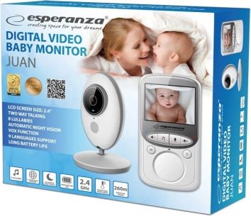 Elektronička bebi monitor ESPERANZA JUAN s 2,4″ LCD-om, noćnim vidom, interkomom, VOX-om i mjerenjem temperature. Domet do 260 m, 8 uspavanki, dugo trajanje baterije.