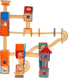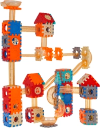Set je izrađen od kvalitetne plastike u živim bojama koje privlače pažnju. Nakon dovršetka dovoljno je ubaciti kuglicu u gornji lijevak i promatrati kako prolazi stazom – to je ne samo zabavno, već i opuštajuće. Dio kompleta su i dekorativne naljepnice za personalizaciju građevina.